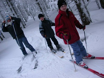 Le vendredi 18 février 2005, l’équipe des minimes masculins 1 est allée passer une journée de ski au Ventron dans les Vosges. Florian, Elie et Nathan allaient en profiter pour faire connaissance avec le ski alpin. Après quelques cours «express» dispensés par Nathalie et Geoffroy, ils parvinrent tout trois à skier l’après-midi. |